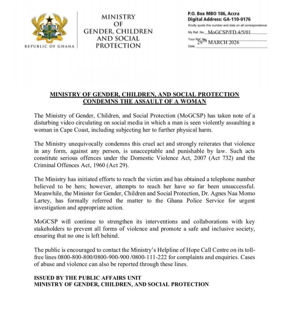 Ghana’s Ministry of Gender, Children, and Social Protection responded on Sunday, March 29, with a statement that left nothing ambiguous. Officials called the assault “cruel and unacceptable” and reminded Ghanaians that such conduct violates not one but two statutes โ the Domestic Violence Act of 2007 and the Criminal Offences Act of 1960. Both carry penalties serious enough to change a perpetrator’s life. The Ministry said it had tracked down a phone number associated with the victim and attempted contact, but she had not responded by the time the statement went out.